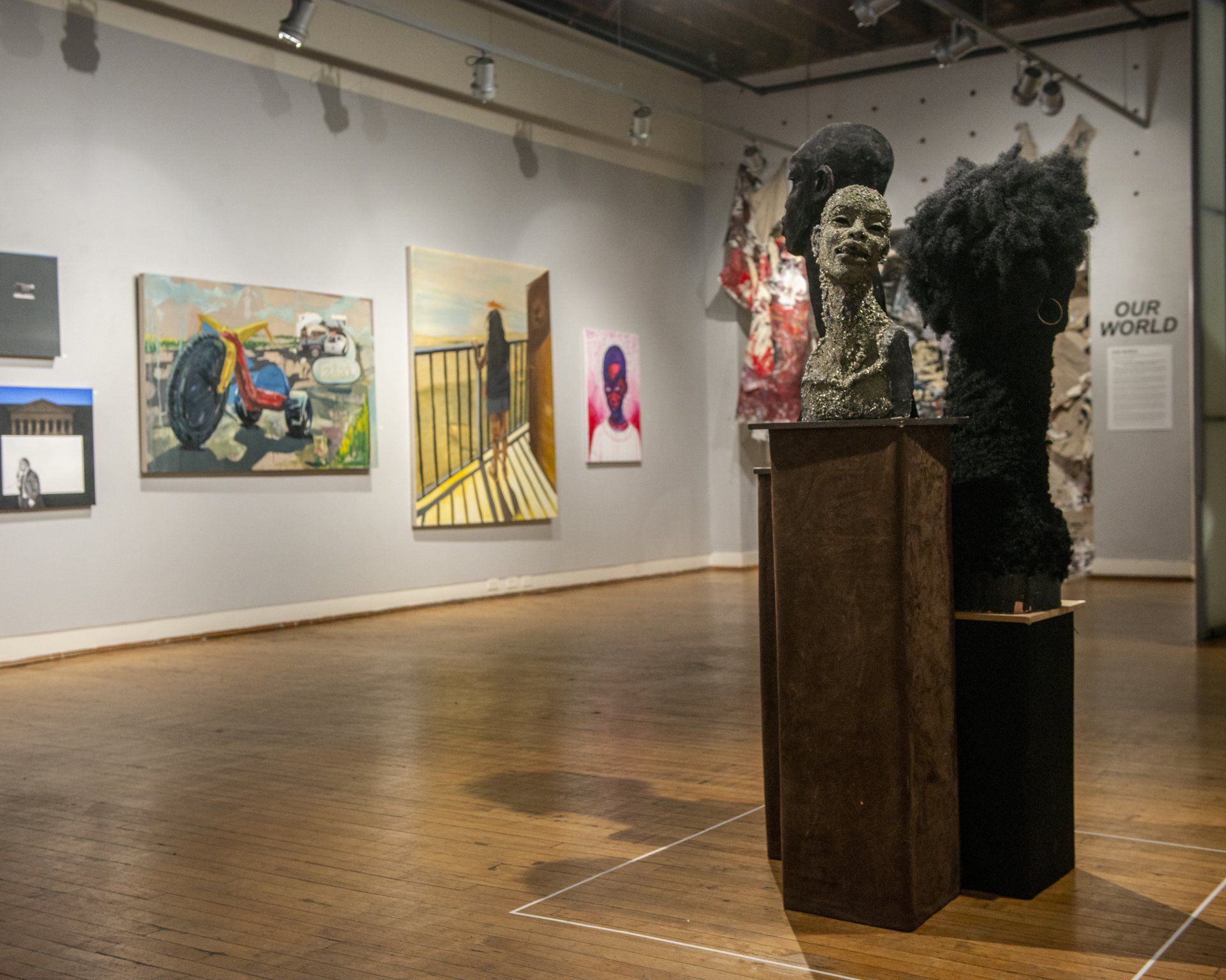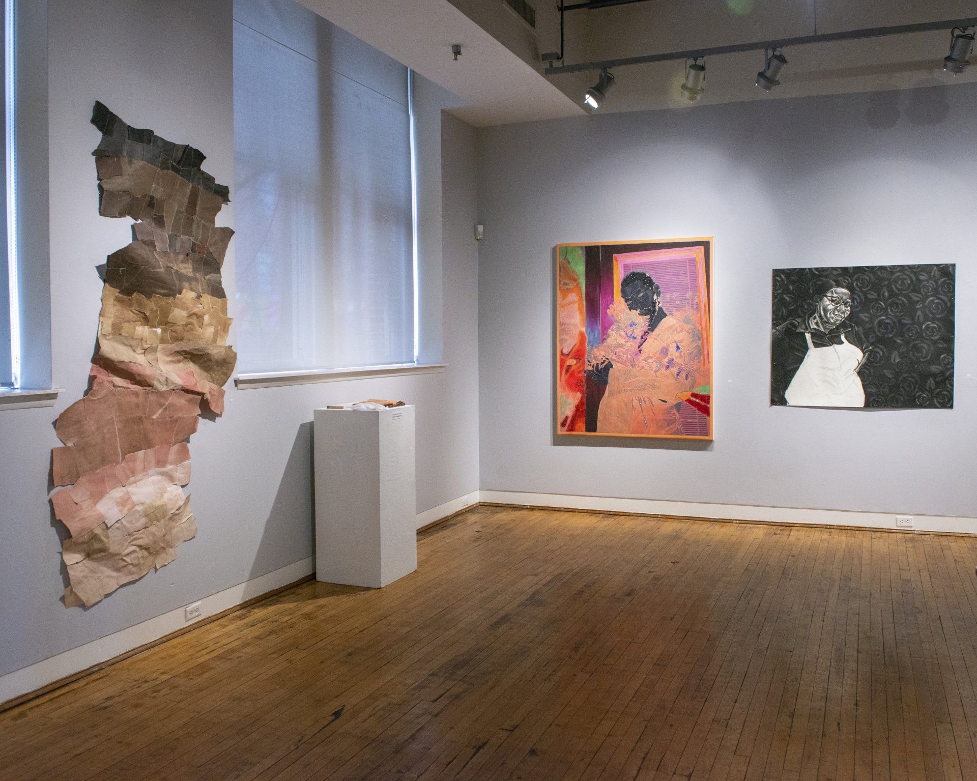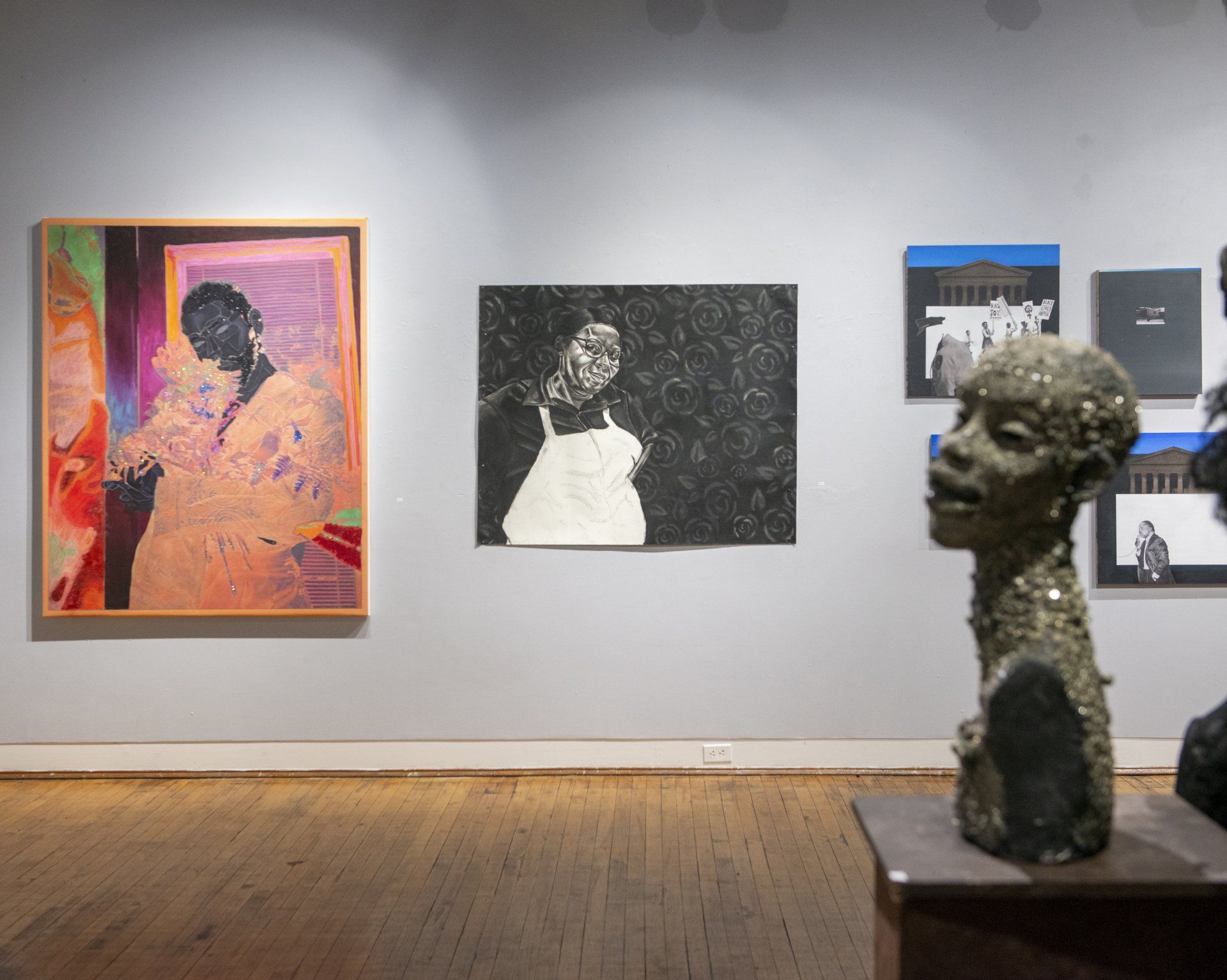 showcased artwork in which the artists question themselves and their perceptions of Blackness based on their experiences, as well as how Blackness is viewed through the lens of the dominant society in America. Working in an array of mediums, the artists have been able to capture the essence of Black American culture with works specifically focusing on Black hair, Black skin, family heritage, past experiences, and hopes, dreams, and expectations for the future. Through portraits, sculptures, photographs, collages, mixed media, abstract, and found object works,