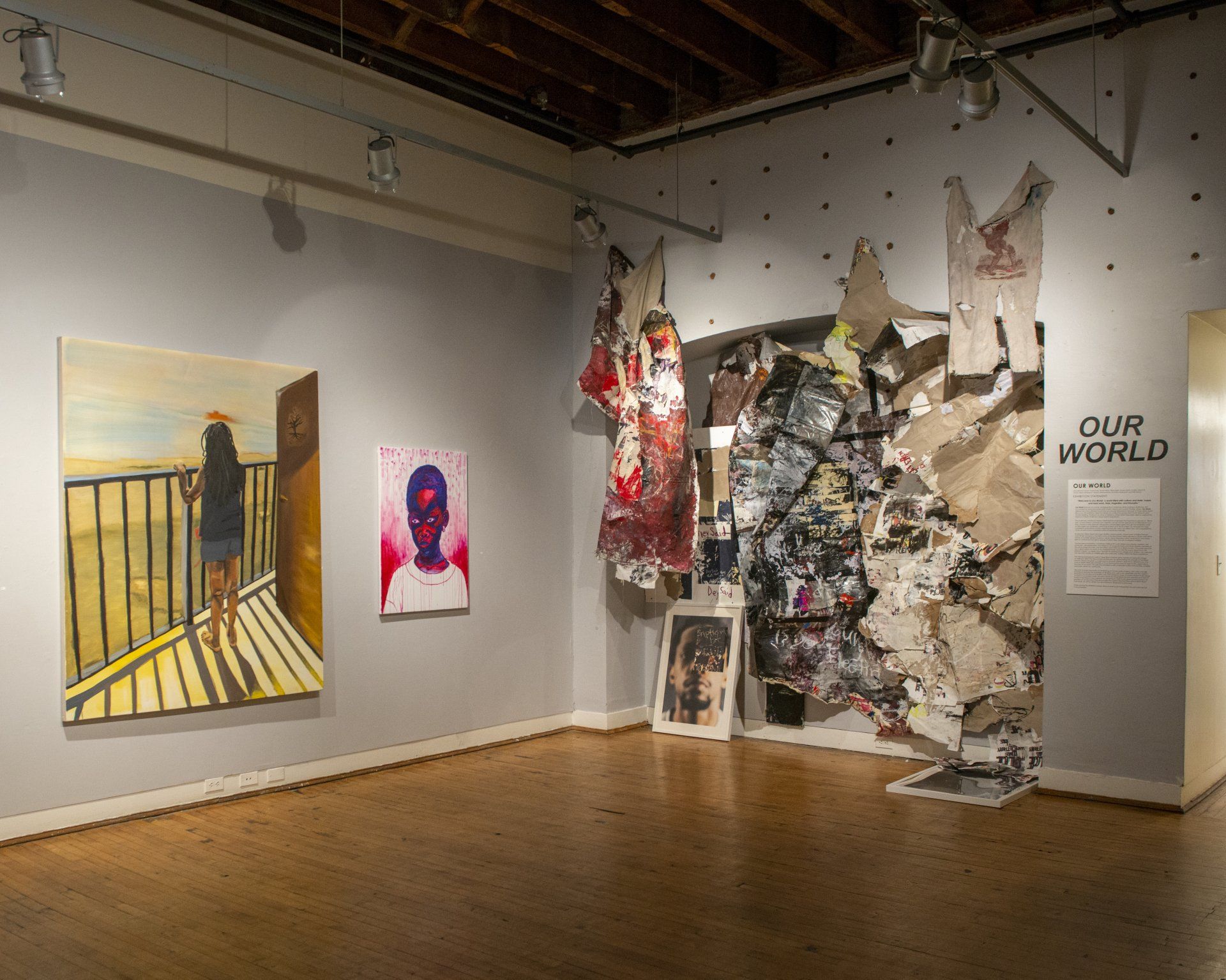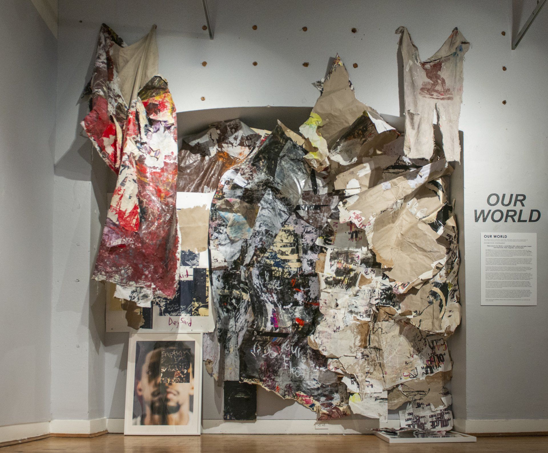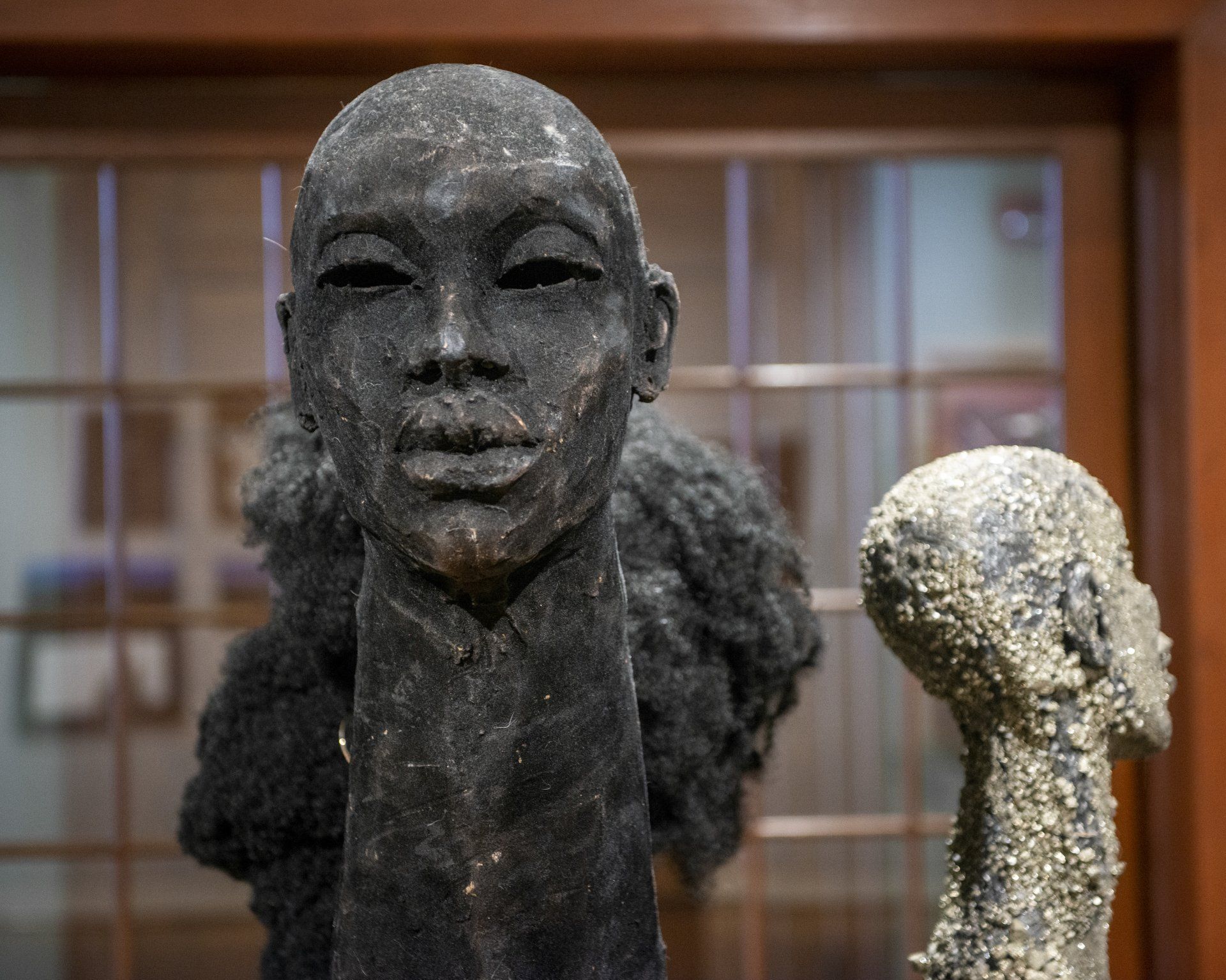showcased artwork in which the artists question themselves and their perceptions of Blackness based on their experiences, as well as how Blackness is viewed through the lens of the dominant society in America. Working in an array of mediums, the artists have been able to capture the essence of Black American culture with works specifically focusing on Black hair, Black skin, family heritage, past experiences, and hopes, dreams, and expectations for the future. Through portraits, sculptures, photographs, collages, mixed media, abstract, and found object works,