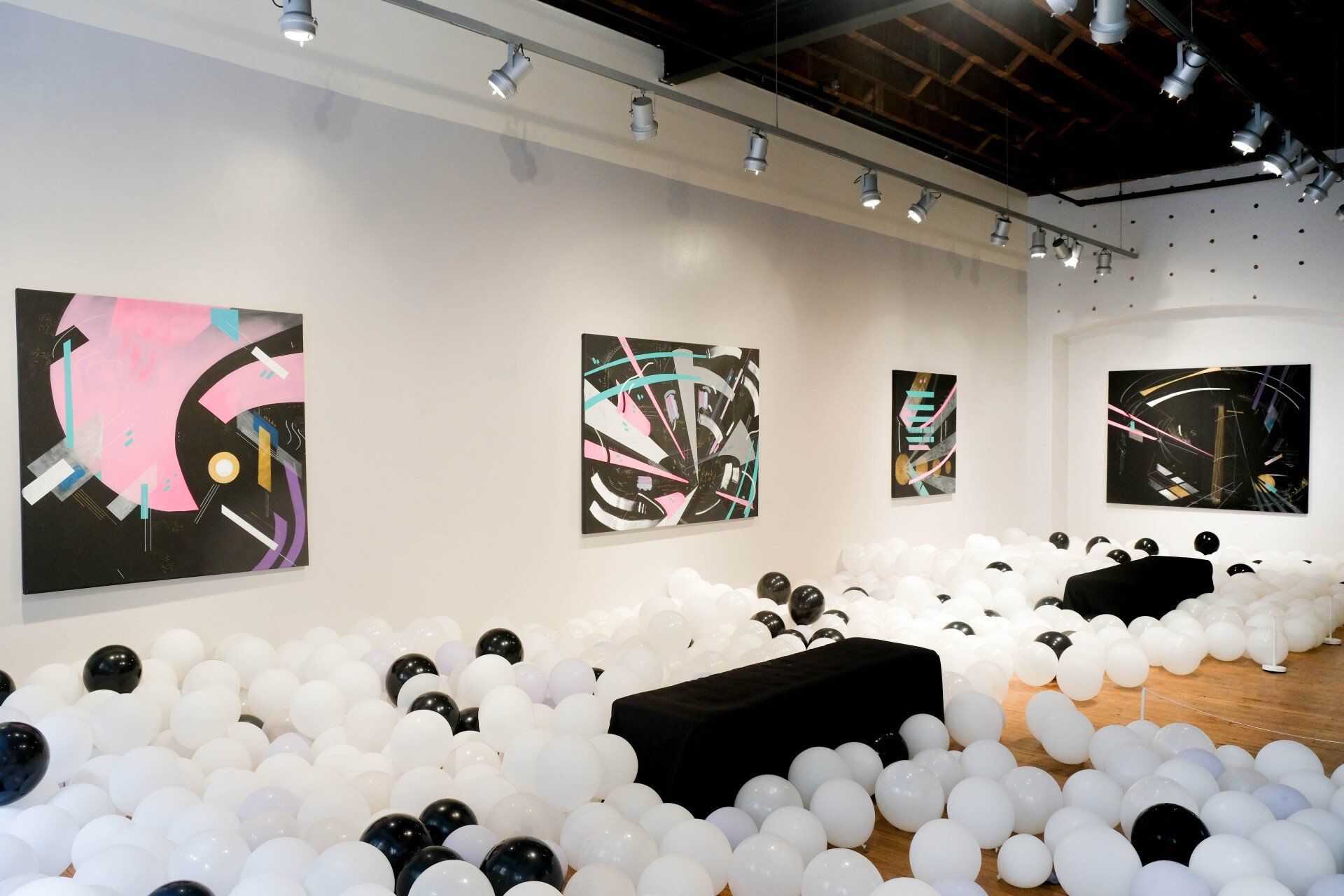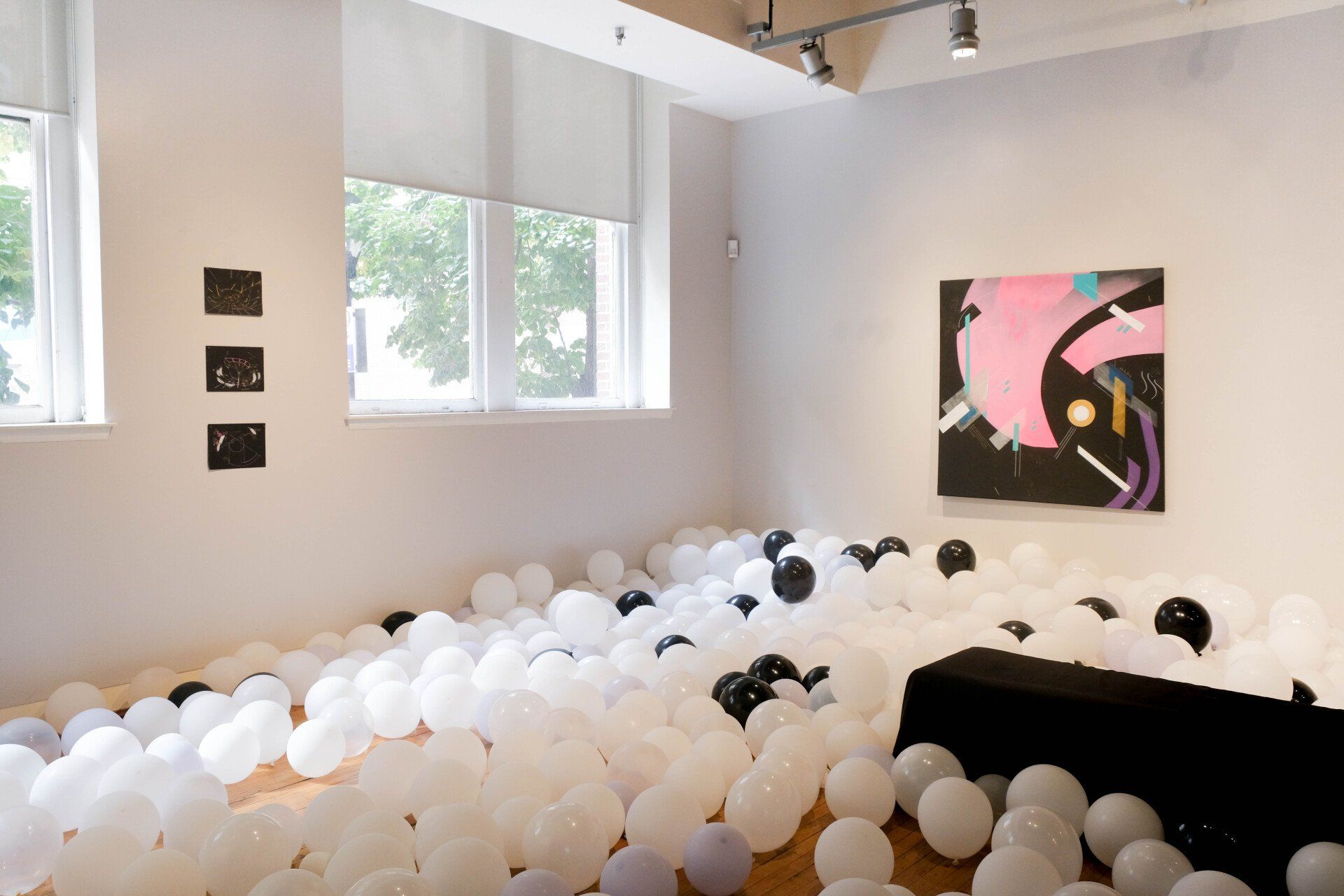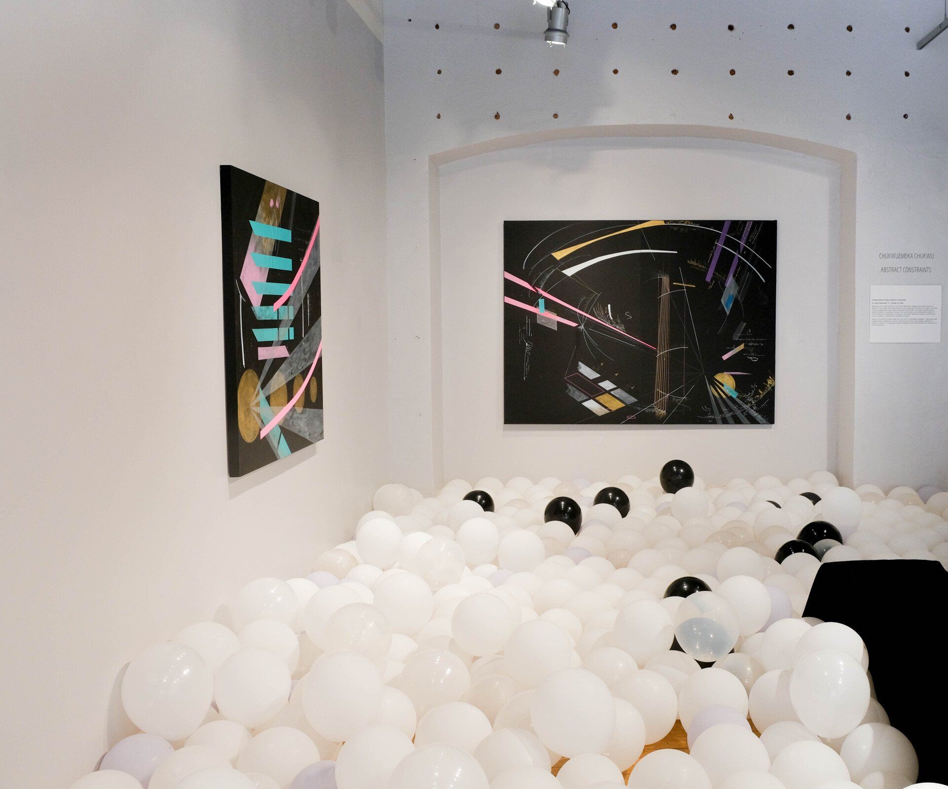 While in school, Chukwu studied architecture. Rivalling at the chance to explore the usage of space, Chukwu utilizes a minimalist exhibition focusing on just four works. The sharp, calculated mark-making of his paintings, and usage of balloons along the gallery floor, dares the eye to dance around the entire space.