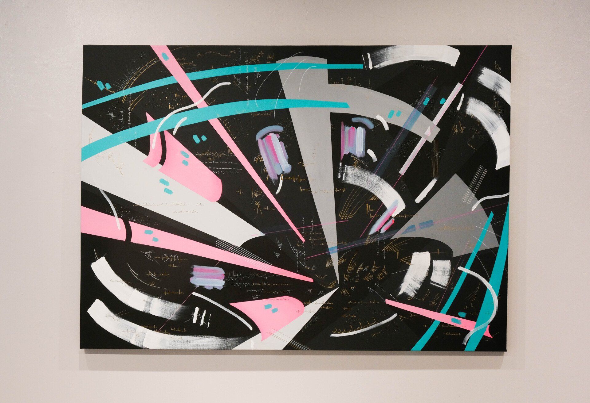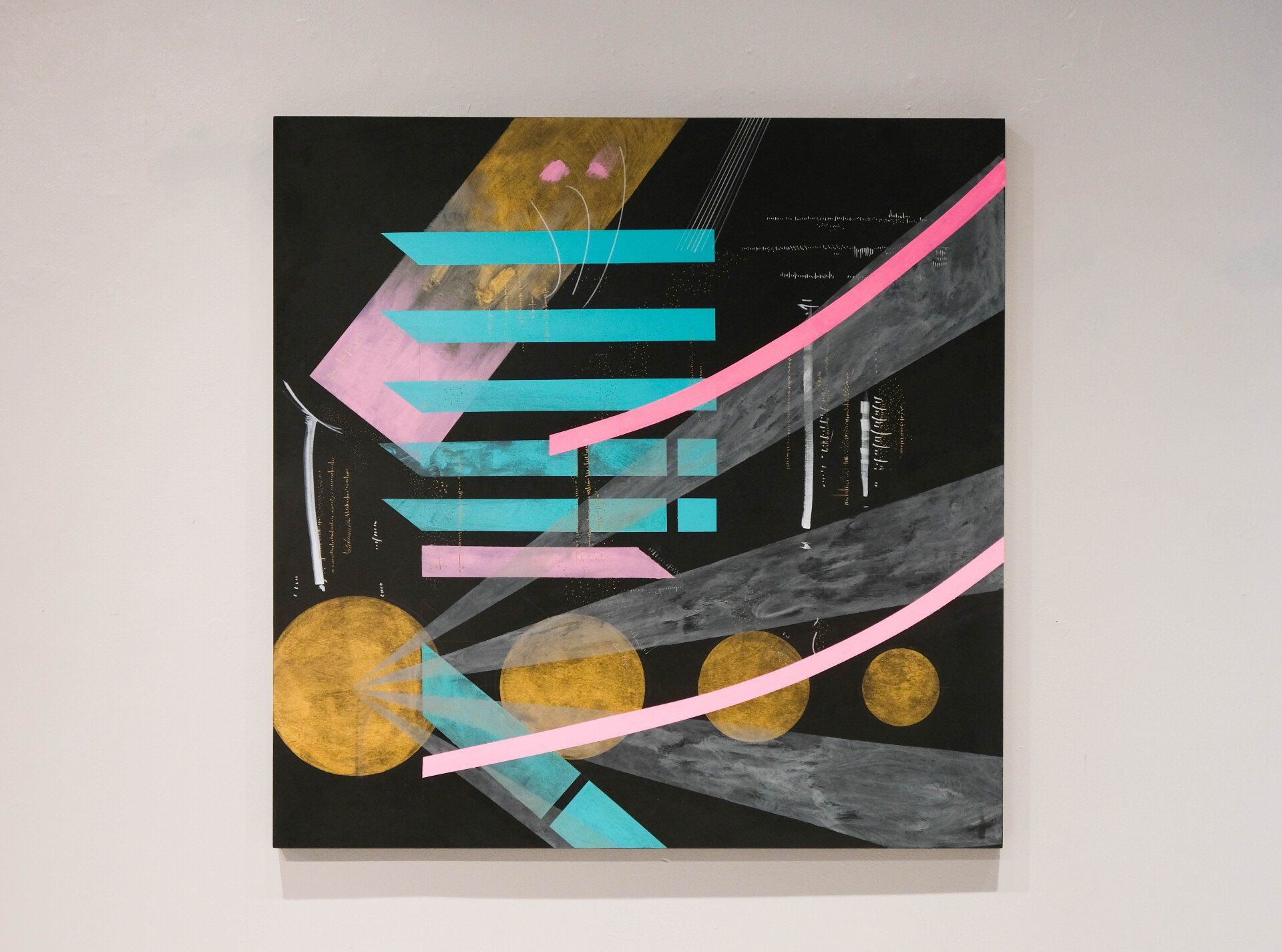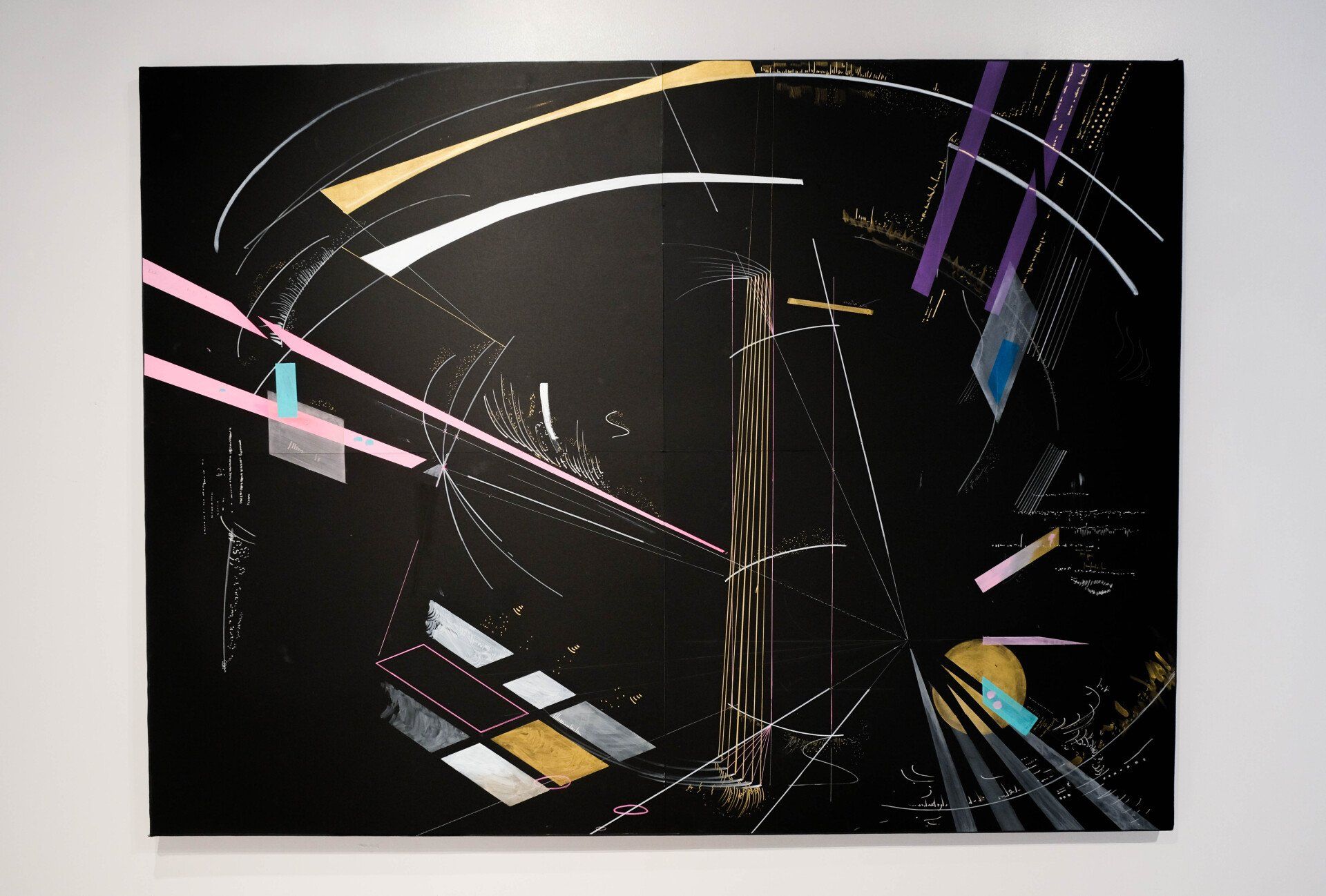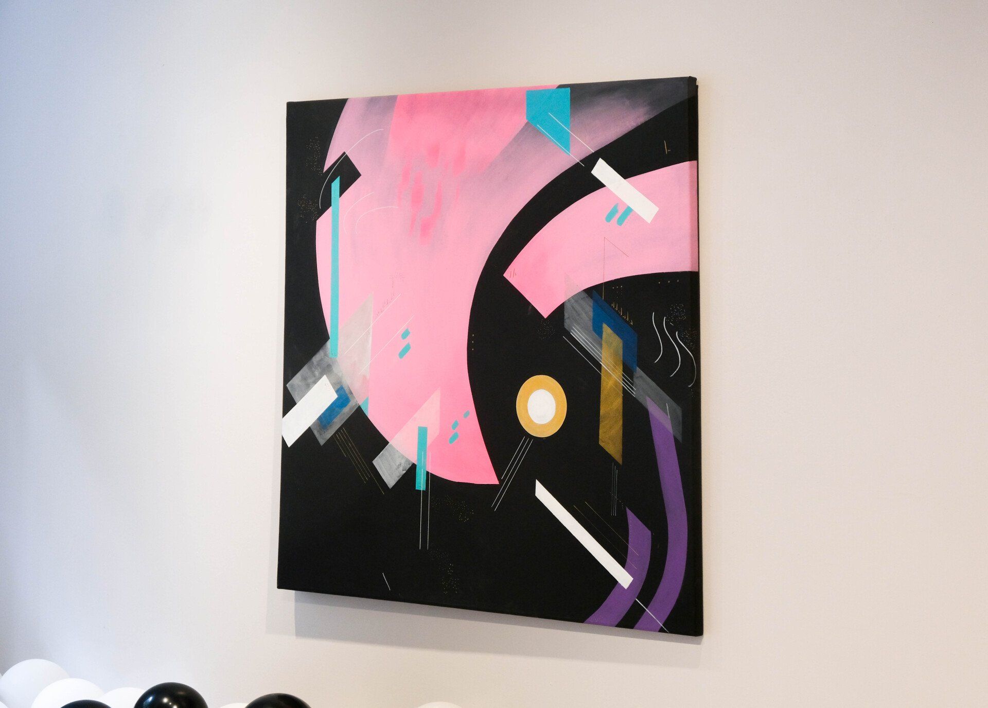 While in school, Chukwu studied architecture. Rivalling at the chance to explore the usage of space, Chukwu utilizes a minimalist exhibition focusing on just four works. The sharp, calculated mark-making of his paintings, and usage of balloons along the gallery floor, dares the eye to dance around the entire space.