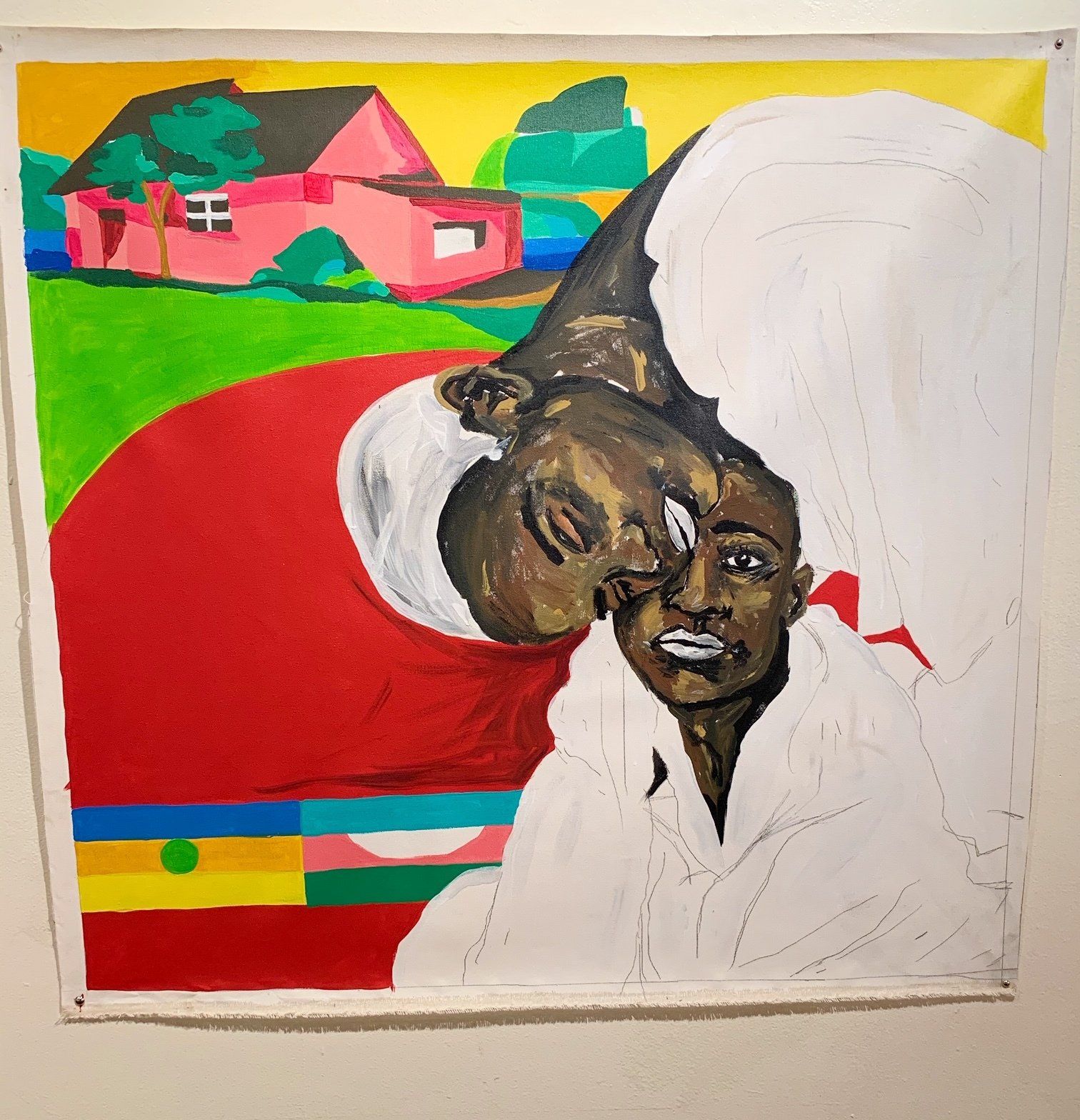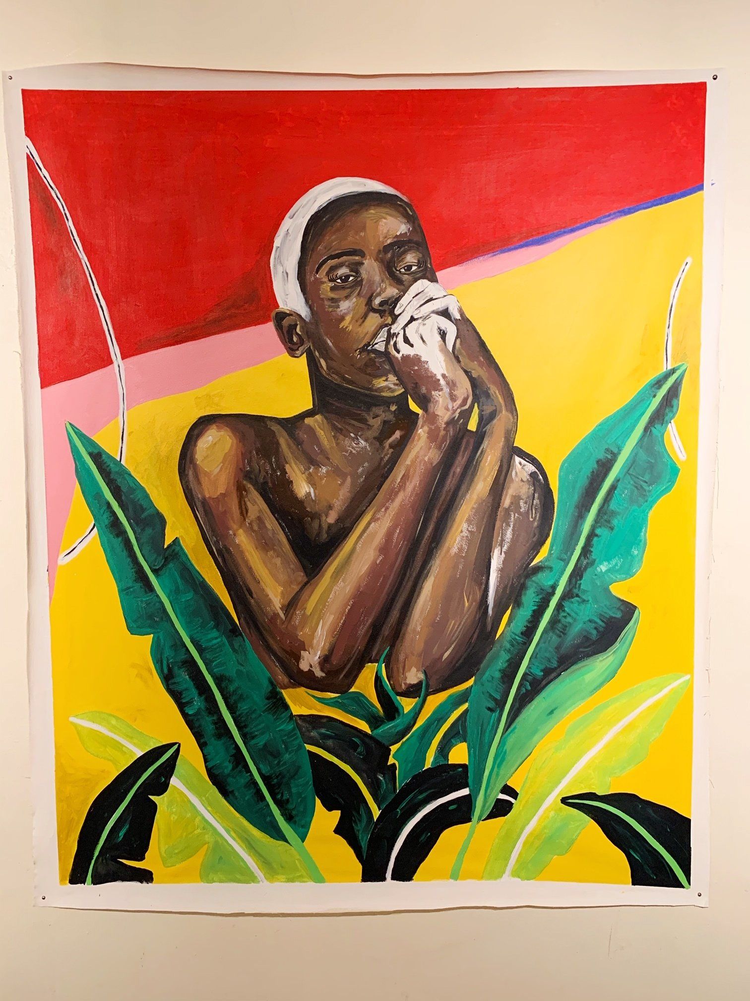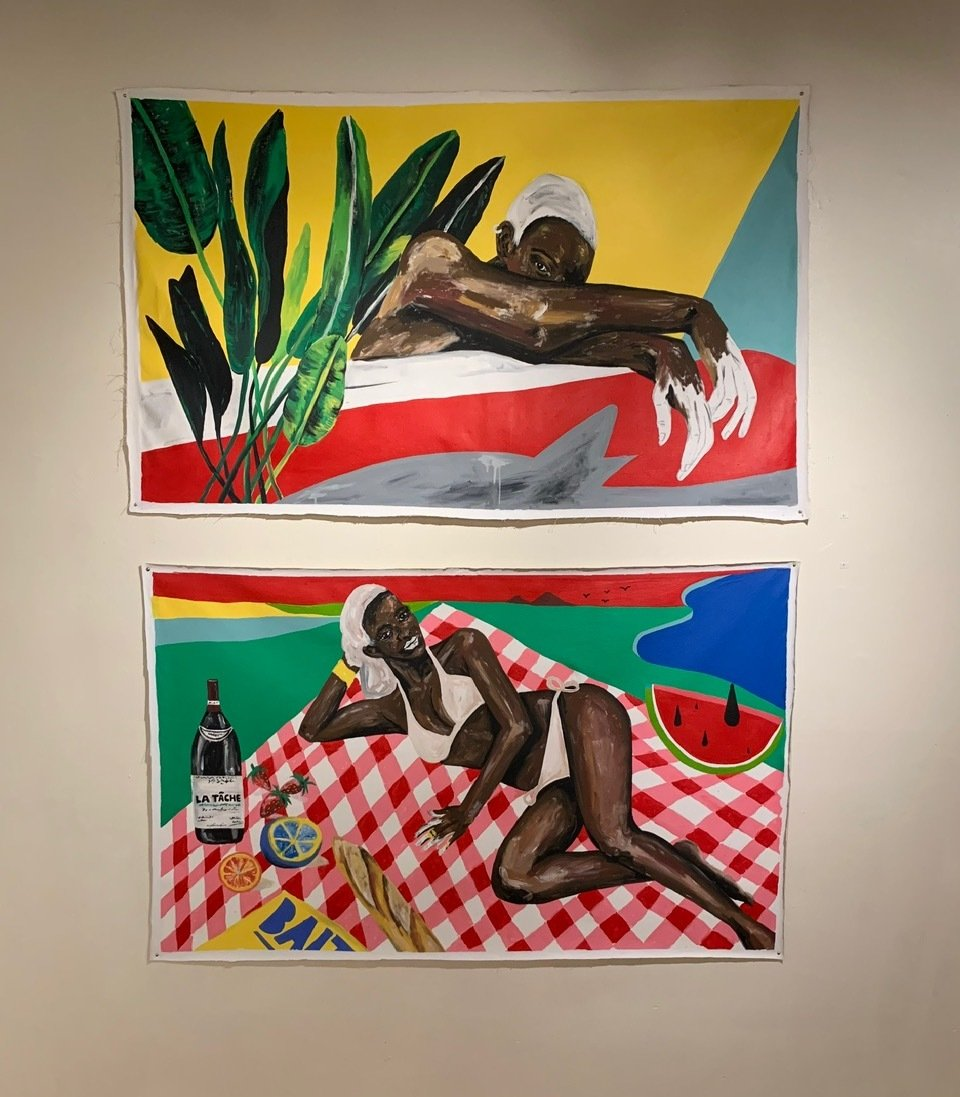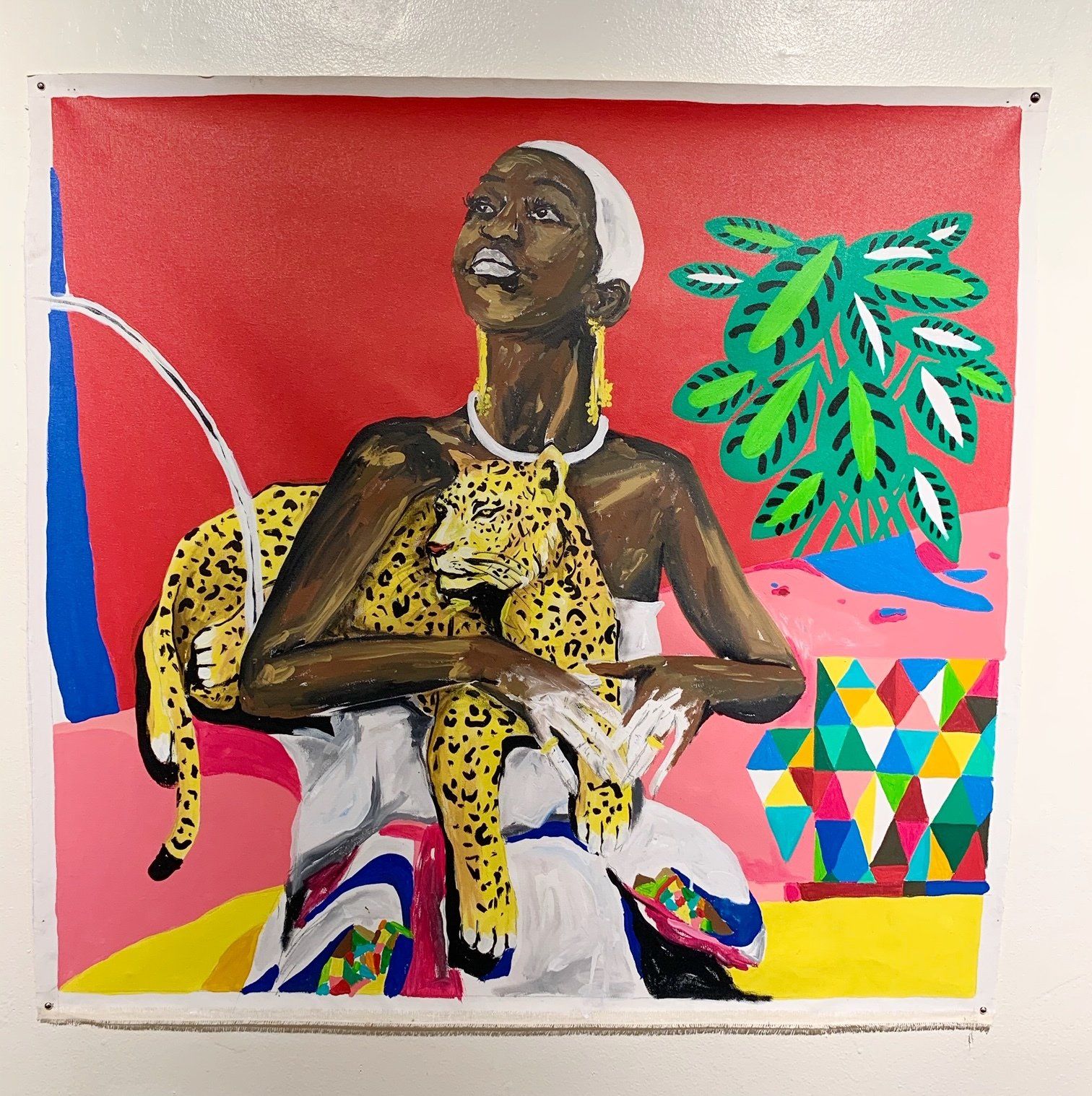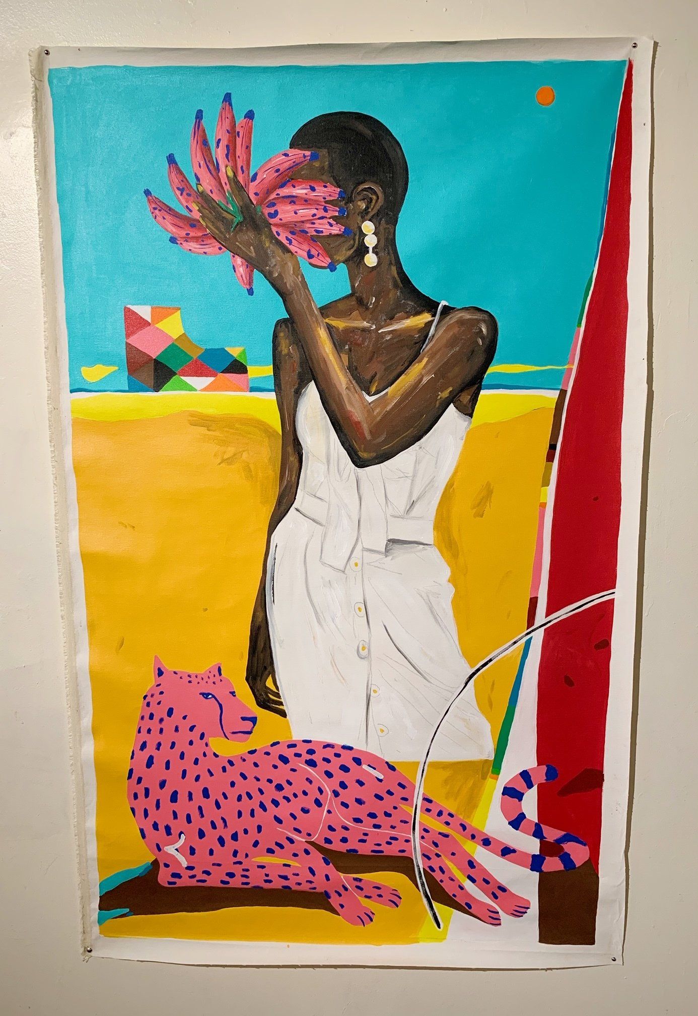 The artwork in this exhibition depict the Black figure surrounded by nature, fantasy, and objects associated with leisure, while keeping the environments and subjects in-tune with one another. The subjects, in their most honest manner, greet you both formally and contextually. These works are like a vintage hand painted commercial street sign for luxury goods, but the exchange is only cultural currency - something you can't buy.